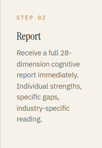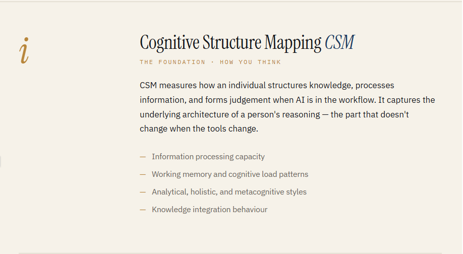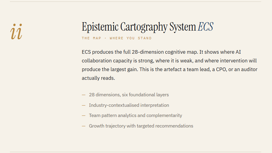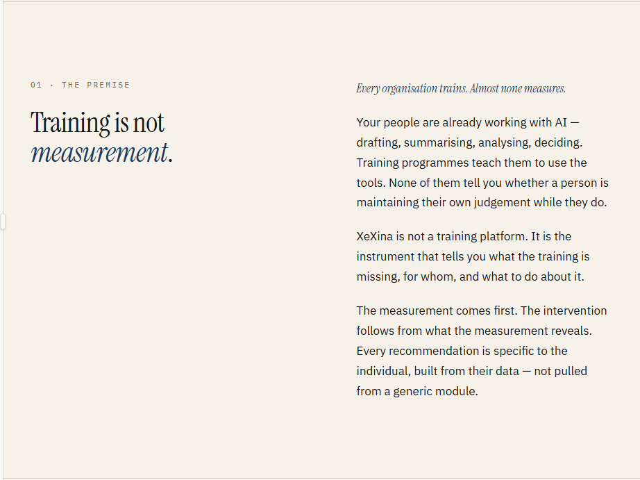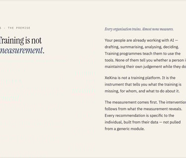 XeXina is the B2B SaaS platform that maps each person's capacity to work effectively alongside AI — across 28 cognitive dimensions, through three integrated measurement systems, with the evidence trail regulators are starting to require.
