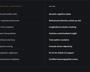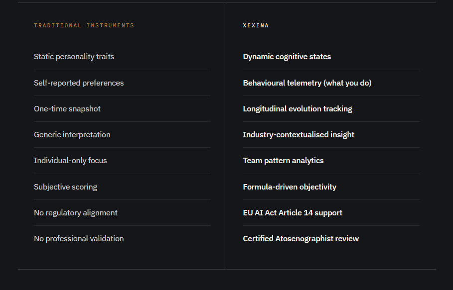 The market is full of instruments that measure static traits or self-reported preferences. XeXina measures something different; and something verifiable.