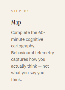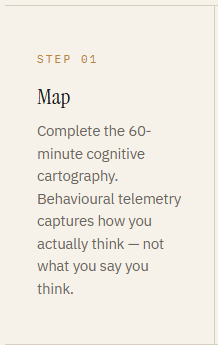 A complete cognitive cartography takes 60 minutes. What it produces lasts.