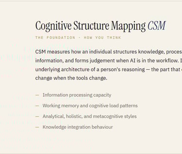 Each system measures a distinct layer of how a person engages with AI. Together they produce a cognitive fingerprint — unique to the individual, actionable at the team level.